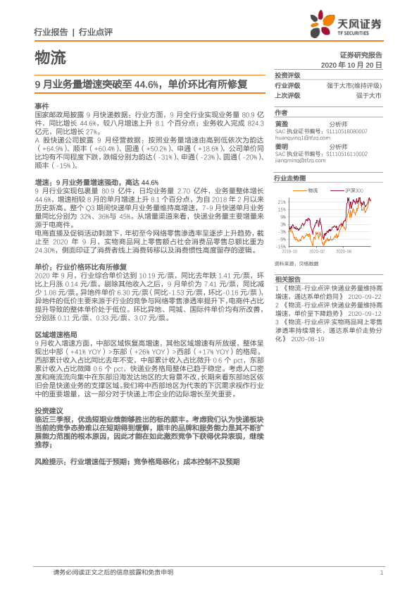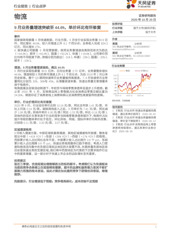 【天风证券】【20201020】物流:9月业务量增速突破至44.6%,单价环比有所修复-8页