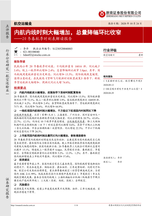 【浙商证券】【20201024】20冬春航季时刻表解读报告:内航内线时刻大幅增加,总量降幅环比收窄-14页