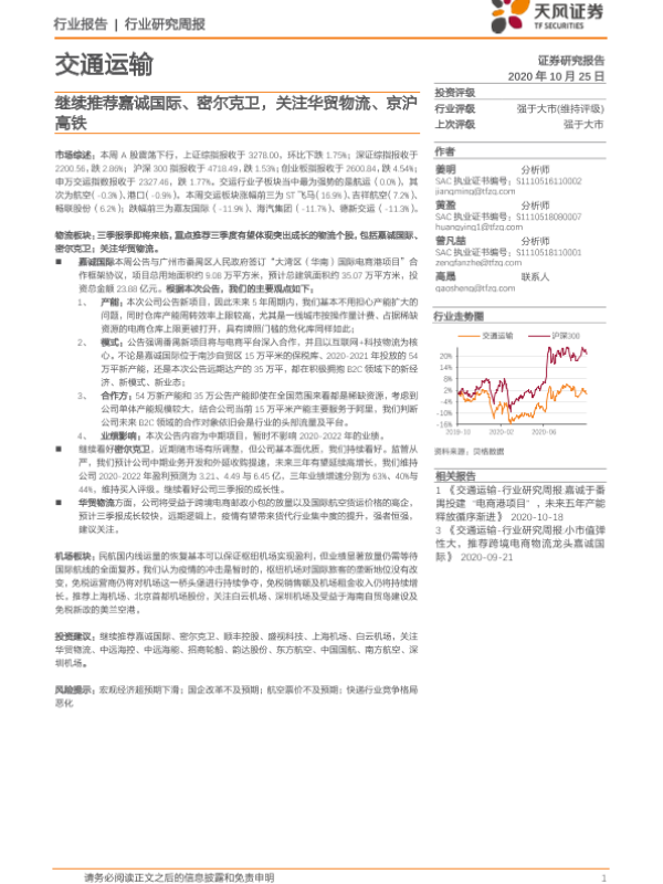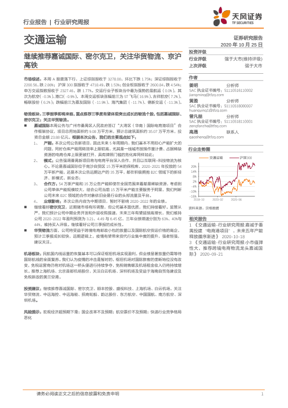 【天风证券】【20201025】交通运输行业研究周报:继续推荐嘉诚国际、密尔克卫,关注华贸物流、京沪高铁-15页