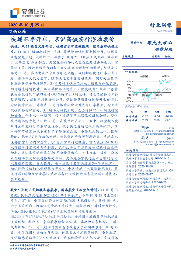【安信证券】【20201025】交通运输行业周报:快递旺季开启,京沪高铁实行浮动票价-19页