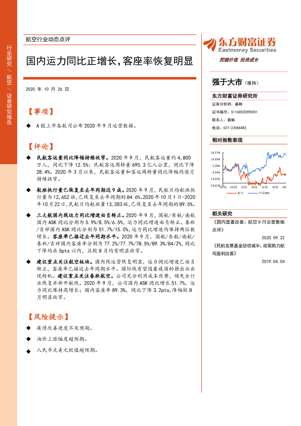 【东方财富证券】【20201026】航空行业动态点评:国内运力同比正增长,客座率恢复明显-9页