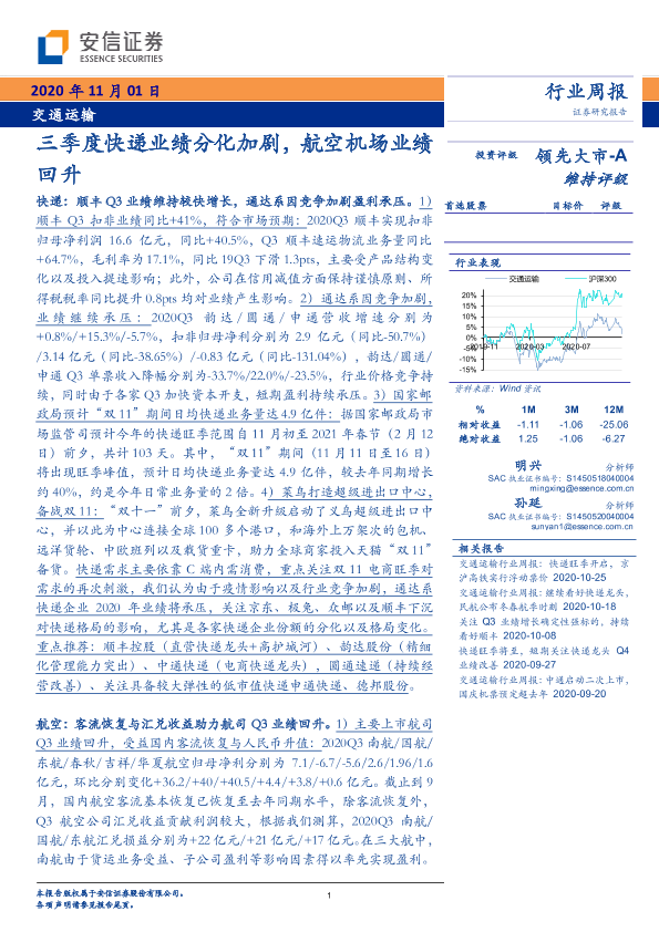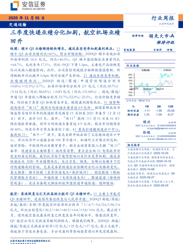 【安信证券】【20201101】三季度快递业绩分化加剧,航空机场业绩回升-18页