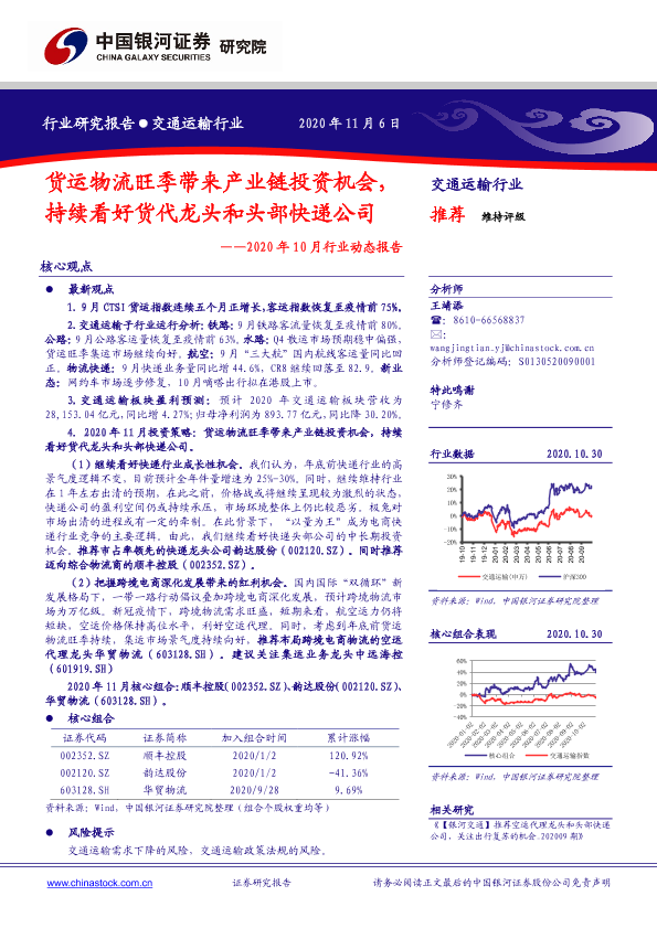 【银河证券】【20201106】交通运输行业2020年10月行业动态报告:货运物流旺季带来产业链投资机会,持续看好货代龙头和头部快递公司-42页