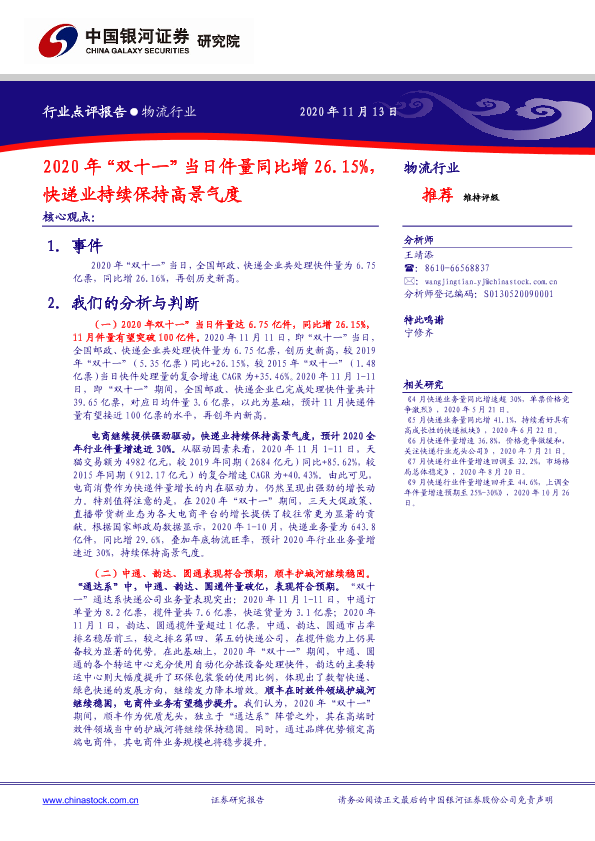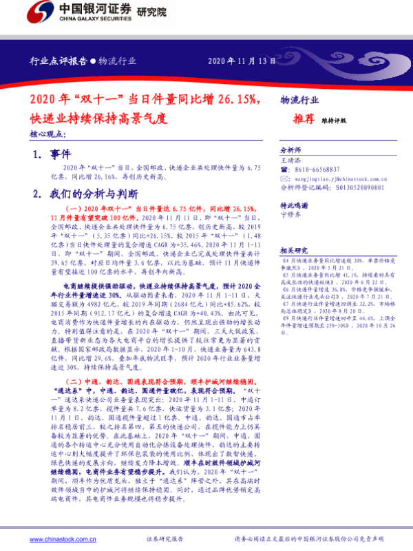 【银河证券】【20201113】2020年“双十一”当日件量同比增26.15%,快递业持续保持高景气度-3页