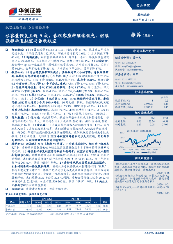 【华创证券】【20201116】航空运输行业10月数据点评:旅客量恢复至近9成,春秋客座率继续领先,继续强推华夏航空与春秋航空-12页