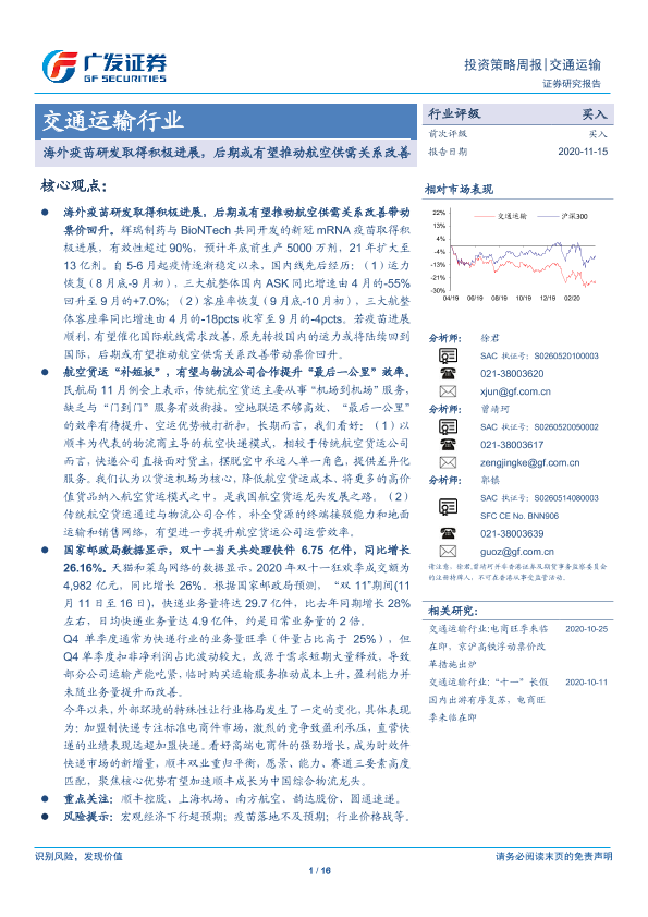 【广发证券】【20201115】交通运输行业:海外疫苗研发取得积极进展,后期或有望推动航空供需关系改善-16页