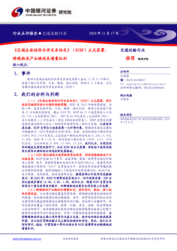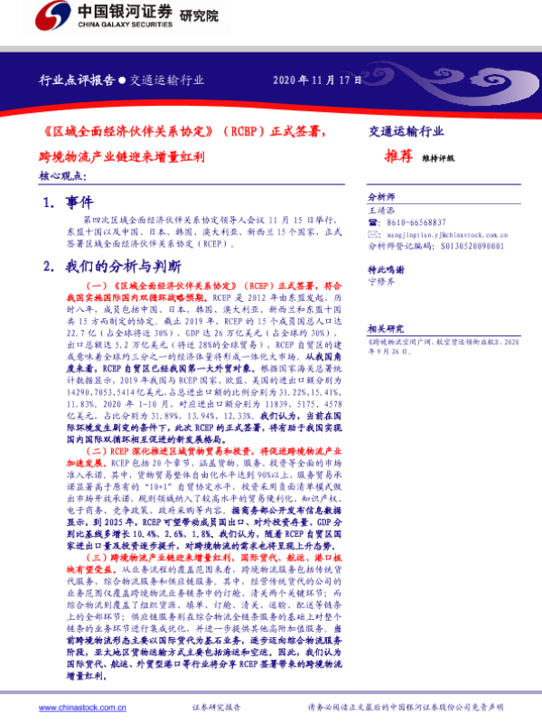 【银河证券】【20201117】《区域全面经济伙伴关系协定》(RCEP)正式签署,跨境物流产业链迎来增量红利-3页