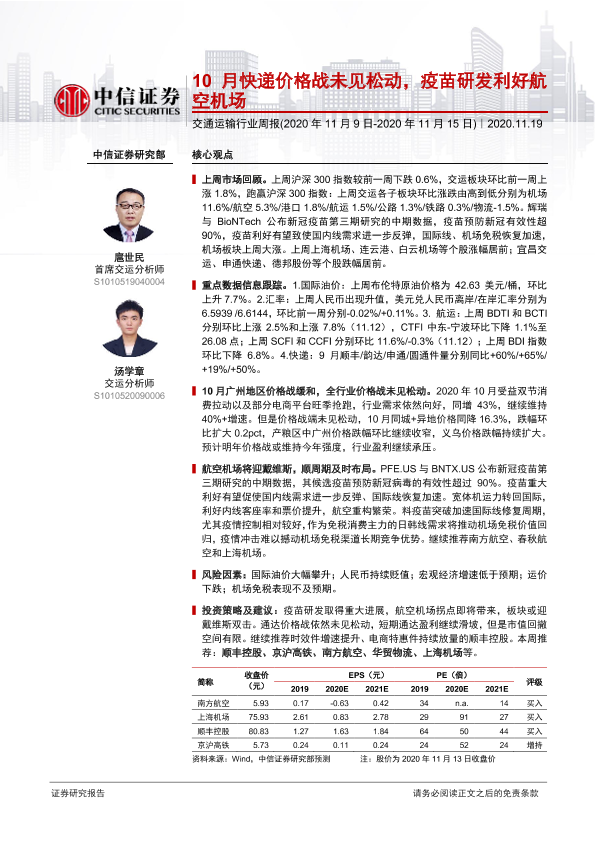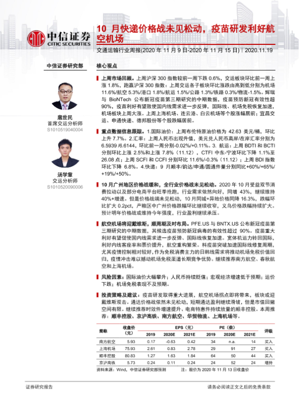 【中信证券】【20201119】10月快递价格战未见松动,疫苗研发利好航空机场-23页