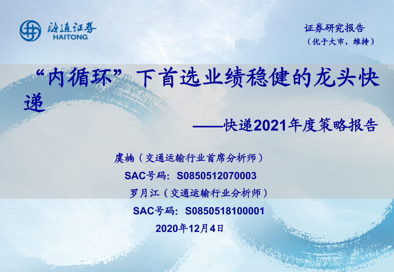 【海通证券】【20201204】快递2021年度策略报告:“内循环”下首选业绩稳健的龙头快递-39页