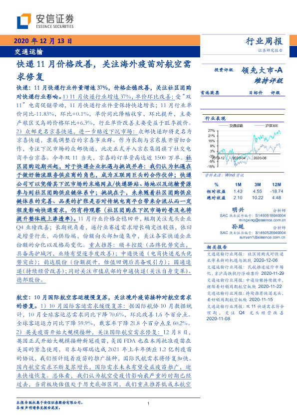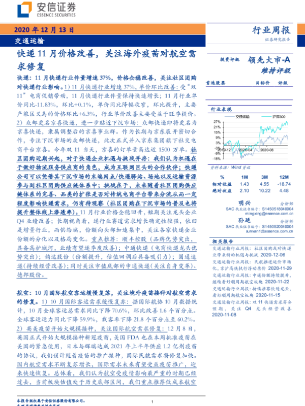 【安信证券】【20201213】快递11月价格改善,关注海外疫苗对航空需求修复-18页
