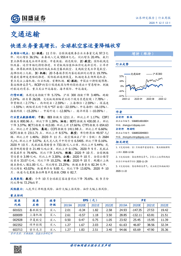 【国盛证券】【20201213】交通运输行业周报:快递业务量高增长,全球航空客运量降幅收窄-21页