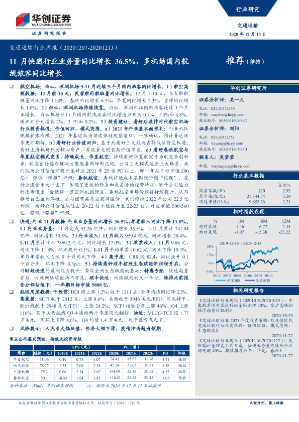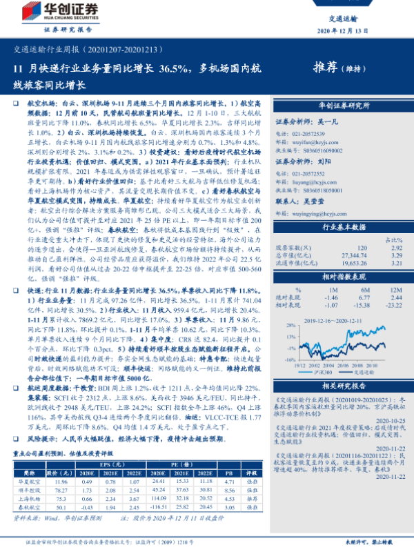 【华创证券】【20201213】交通运输行业周报:11月快递行业业务量同比增长36.5%,多机场国内航线旅客同比增长-21页
