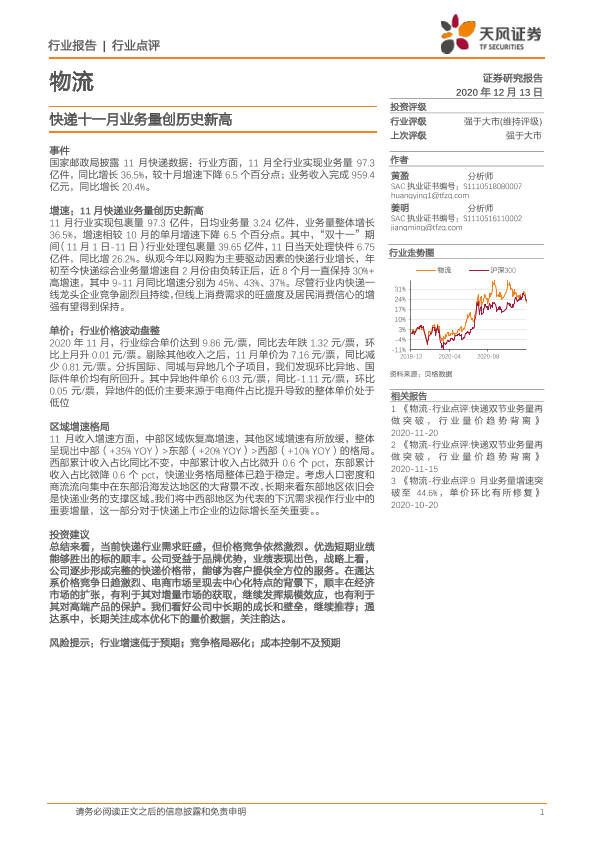 【天风证券】【20201213】物流行业:快递十一月业务量创历史新高-6页