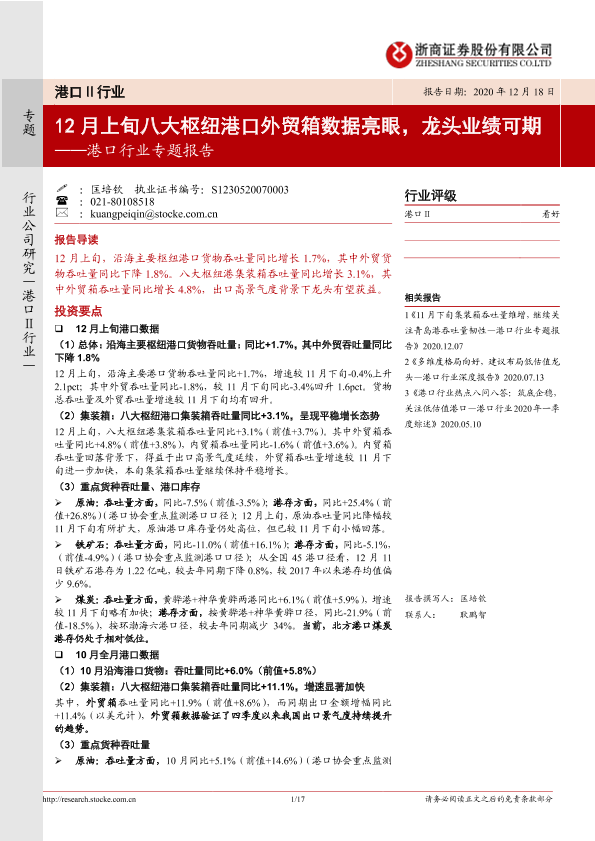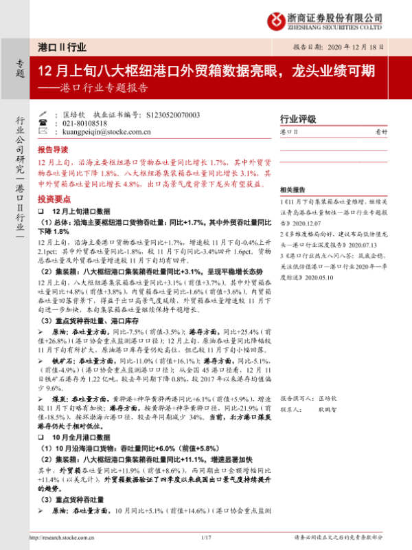 【浙商证券】【20201218】12月上旬八大枢纽港口外贸箱数据亮眼,龙头业绩可期-17页
