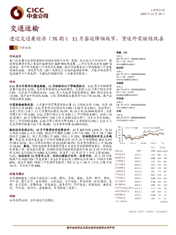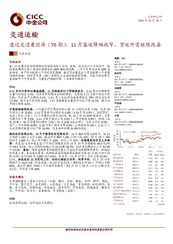 【中金公司】【20201229】透过交通看经济(76期):11月客运降幅收窄,货运外需继续改善-26页