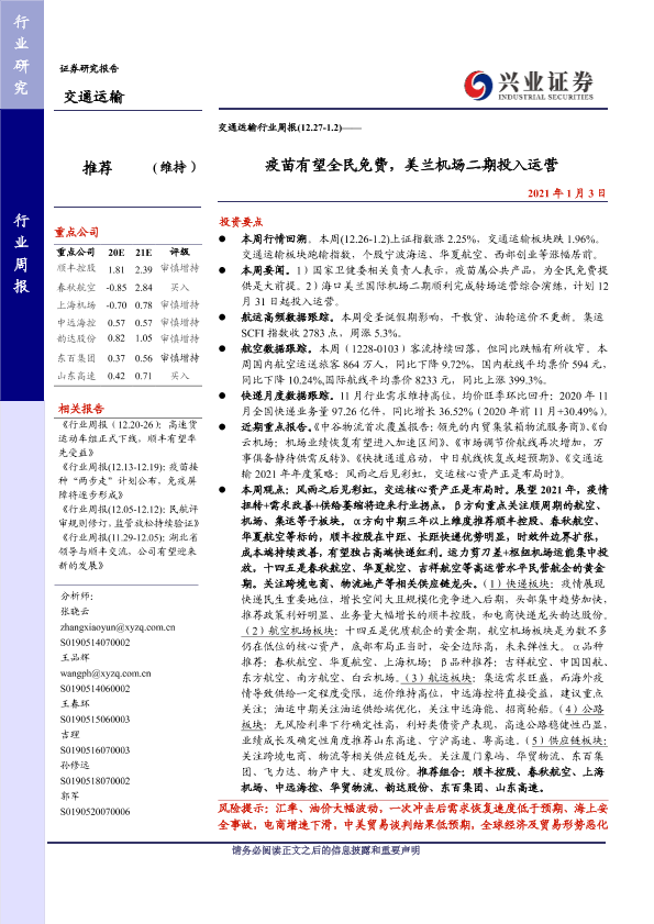 【兴业证券】【20210103】交通运输行业周报:疫苗有望全民免费,美兰机场二期投入运营-20页
