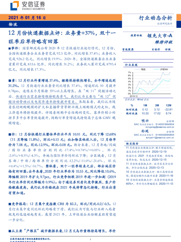 【安信证券】【20210116】12月份快递数据点评:业务量+37%,双十一旺季后单价略有回落-10页
