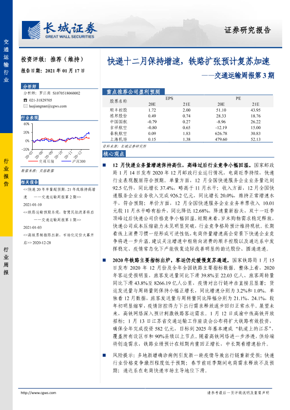 【长城证券】【20210117】快递十二月保持增速,铁路扩张预计复苏加速-19页