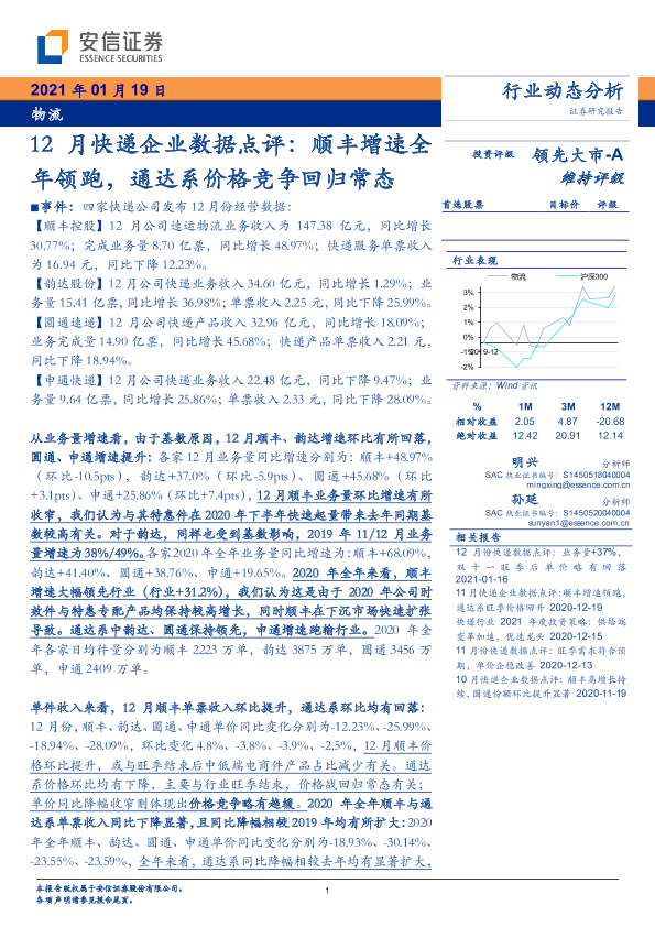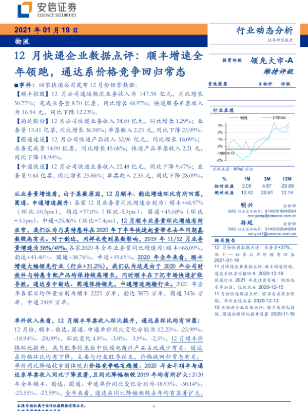 【安信证券】【20210119】物流12月快递企业数据点评:顺丰增速全年领跑,通达系价格竞争回归常态-4页