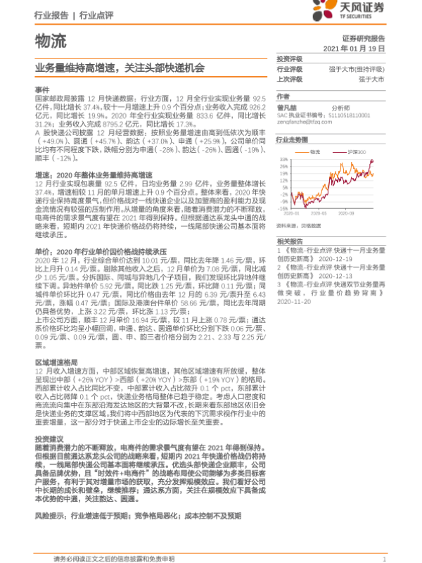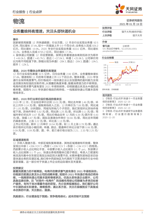 【天风证券】【20210119】物流行业点评:业务量维持高增速,关注头部快递机会-8页