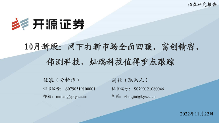 【开源证券】【20221122】10月新股:网下打新市场全面回暖,富创精密、伟测科技、灿瑞科技值得重点跟踪-30页