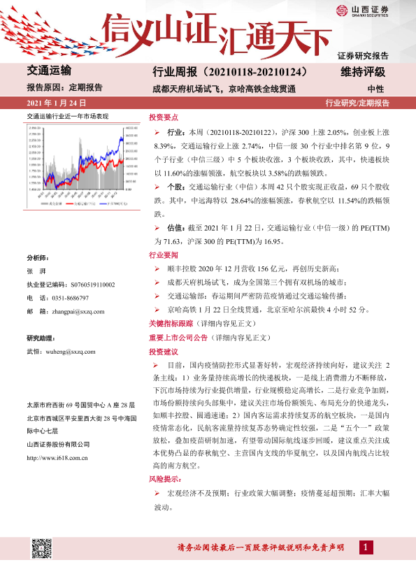 【山西证券】【20210124】交通运输行业周报:成都天府机场试飞,京哈高铁全线贯通-14页