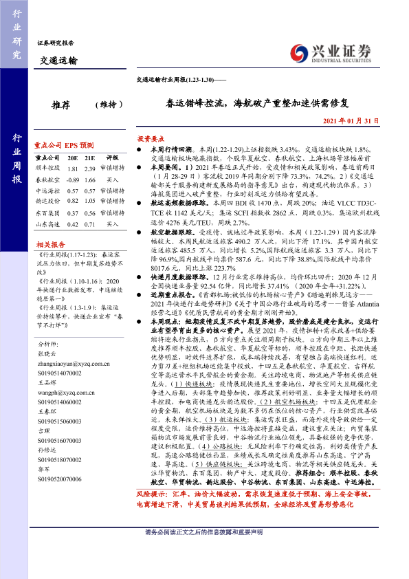 【兴业证券】【20210131】交通运输行业周报:春运错峰控流,海航破产重整加速供需修复-18页