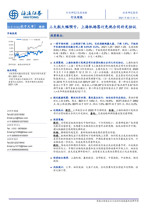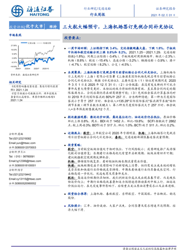 【海通证券】【20210201】交通运输行业周报:三大航大幅预亏,上海机场签订免税合同补充协议-9页