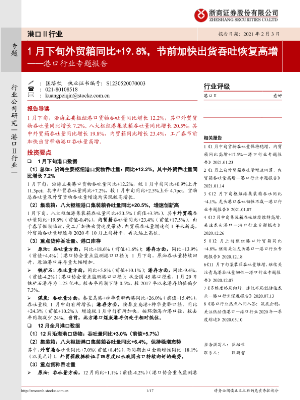 【浙商证券】【20210203】1月下旬外贸箱同比+19.8%,节前加快出货吞吐恢复高增-17页