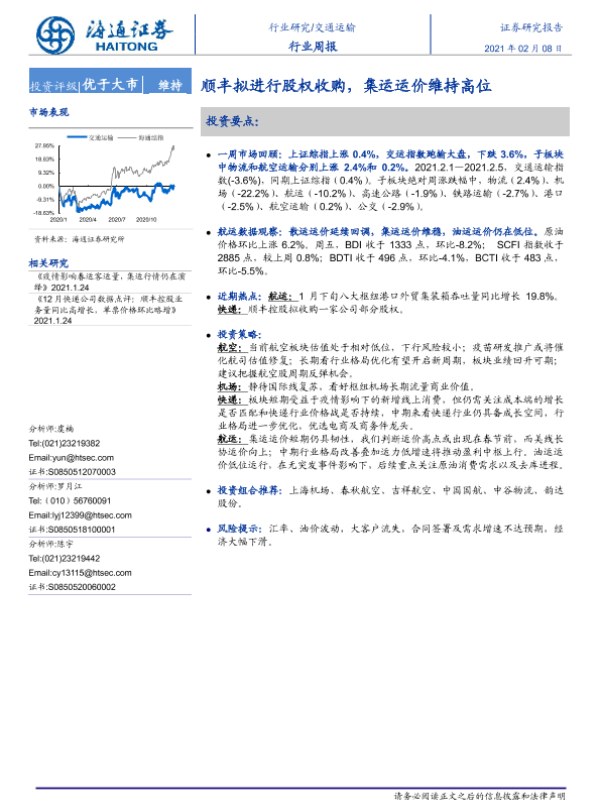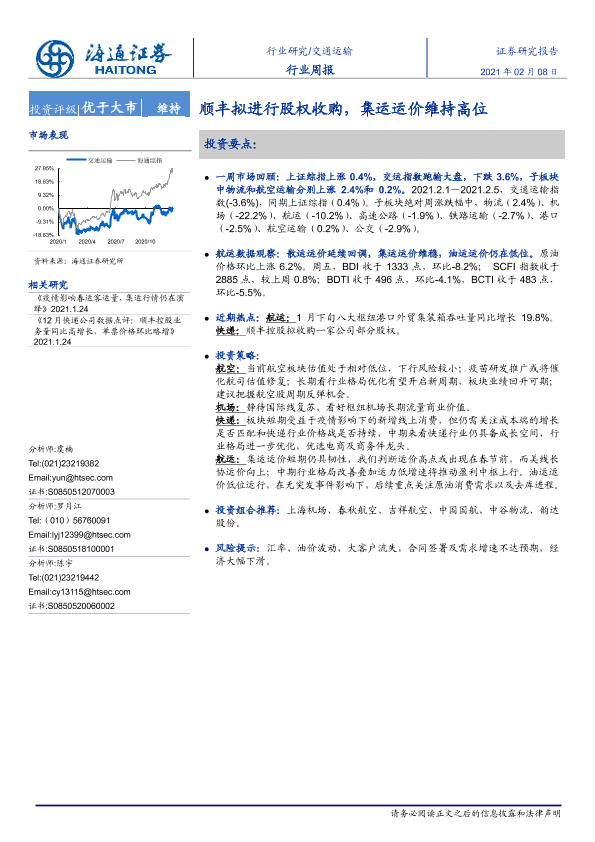 【海通证券】【20210208】交通运输行业周报:顺丰拟进行股权收购,集运运价维持高位-9页