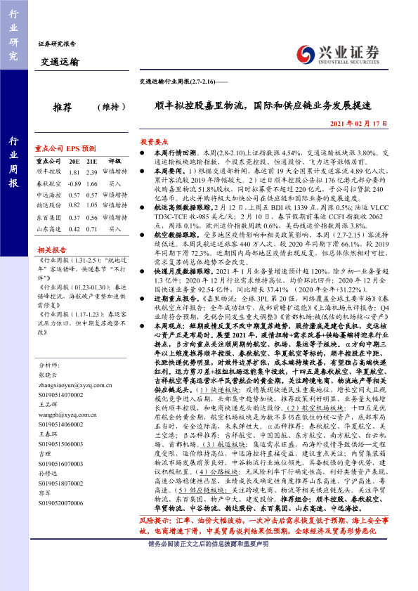 【兴业证券】【20210217】交通运输行业周报:顺丰拟控股嘉里物流,国际和供应链业务发展提速-19页