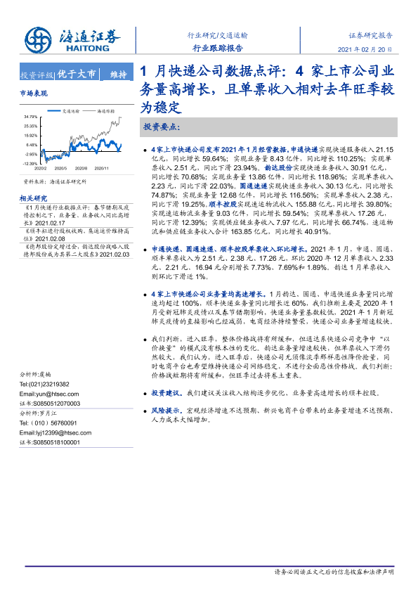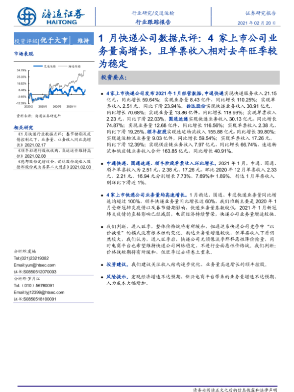 【海通证券】【20210220】1月快递公司数据点评:4家上市公司业务量高增长,且单票收入相对去年旺季较为稳定-3页