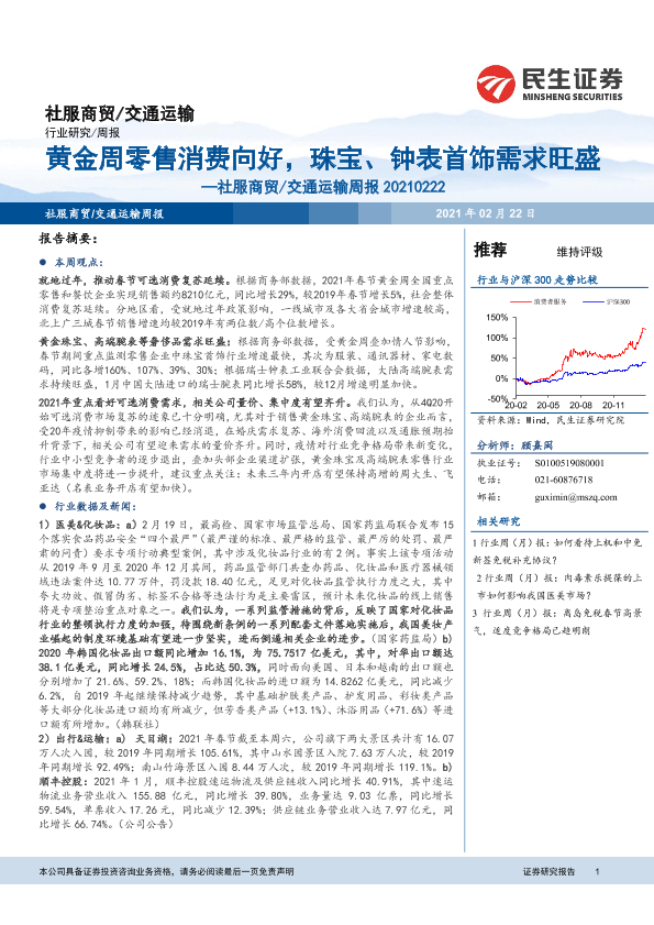 【民生证券】【20210222】社服商贸 交通运输周报:黄金周零售消费向好,珠宝、钟表首饰需求旺盛-11页