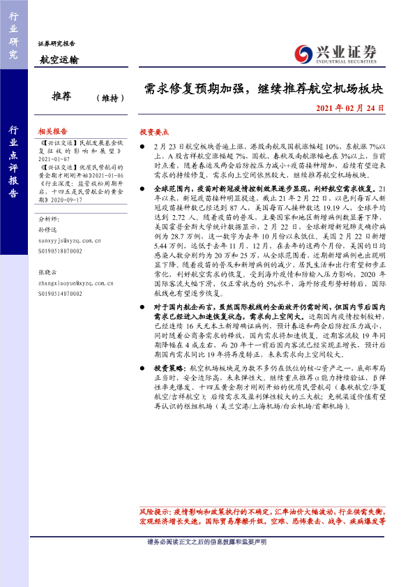 【兴业证券】【20210224】需求修复预期加强,继续推荐航空机场板块-6页