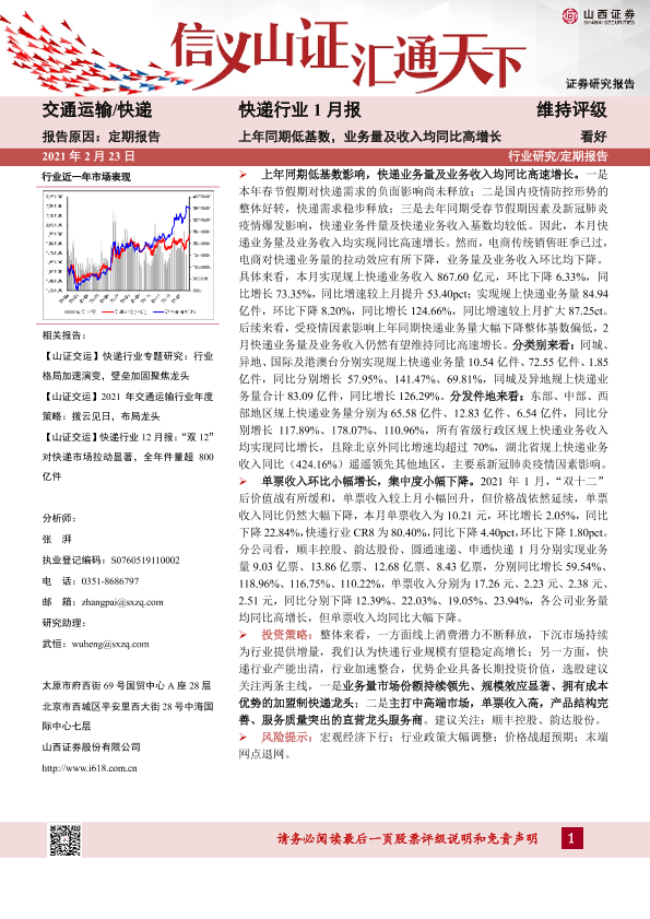 【山西证券】【20210223】快递行业1月报:上年同期低基数,业务量及收入均同比高增长-12页