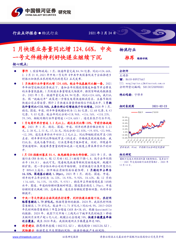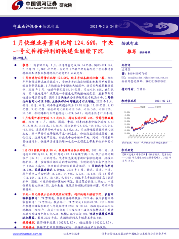 【银河证券】【20210224】1月快递业务量同比增124.66%,中央一号文件精神利好快递业继续下沉-5页