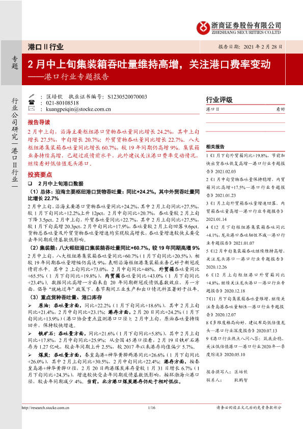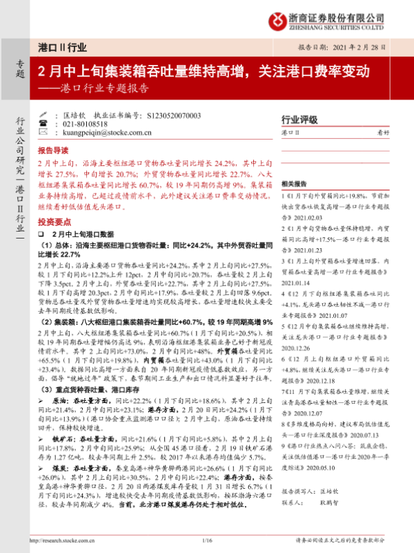 【浙商证券】【20210228】2月中上旬集装箱吞吐量维持高增,关注港口费率变动-16页