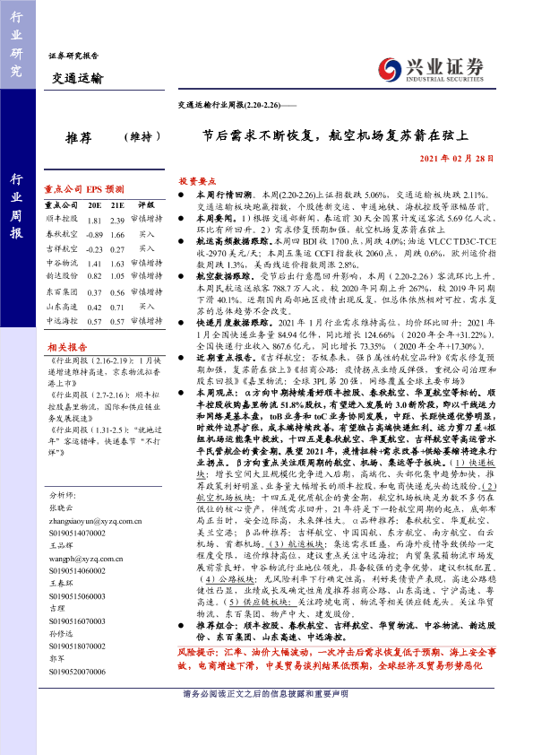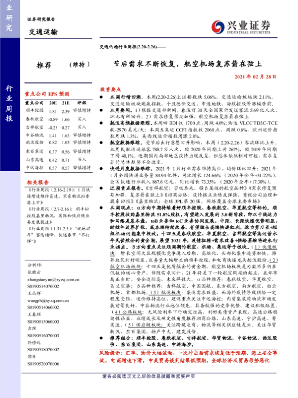 【兴业证券】【20210228】交通运输行业周报:节后需求不断恢复,航空机场复苏箭在弦上-19页