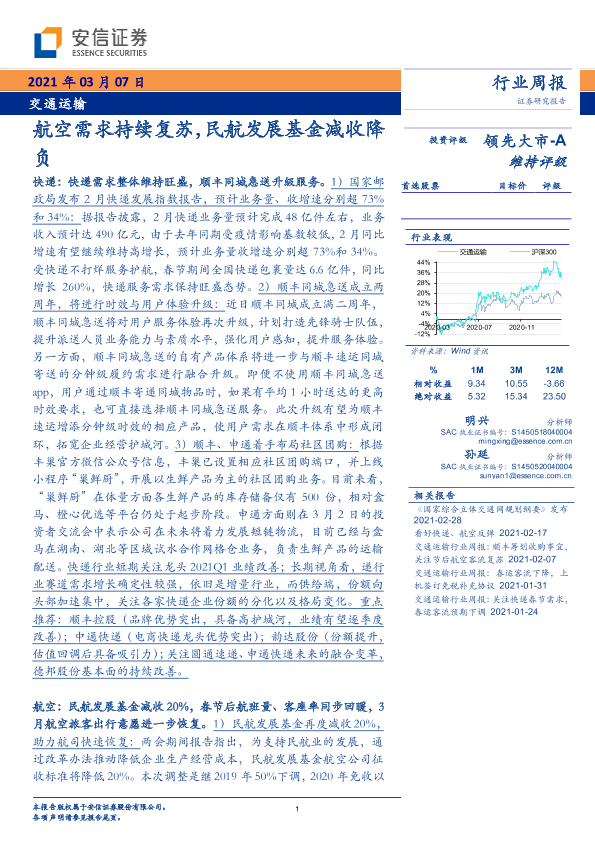 【安信证券】【20210307】交通运输行业周报:航空需求持续复苏,民航发展基金减收降负-18页
