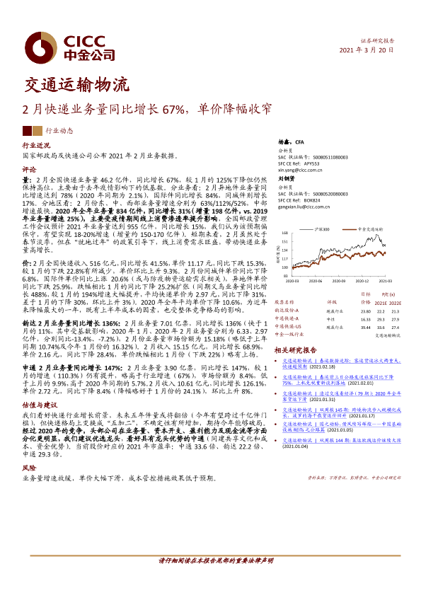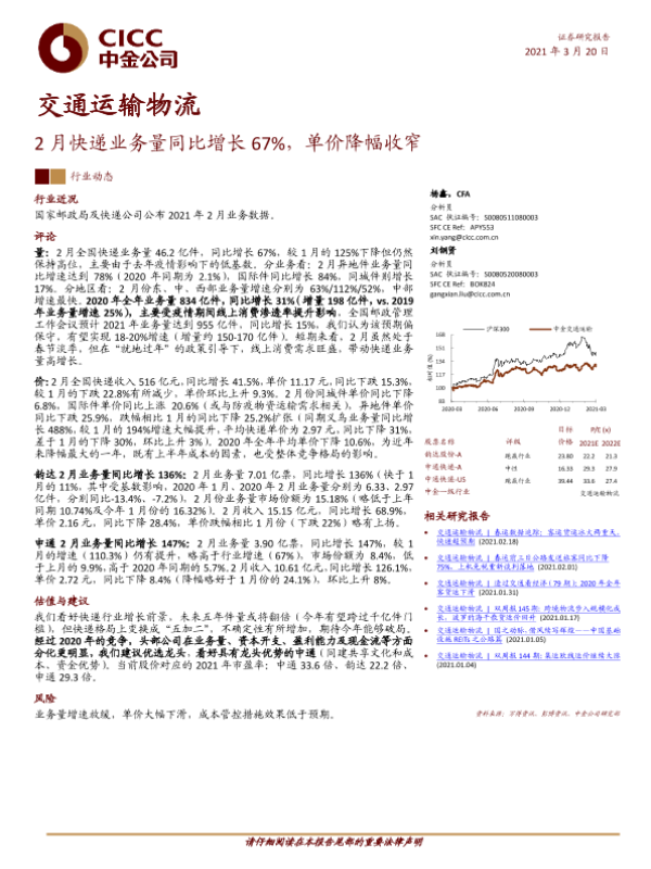 【中金公司】【20210320】2月快递业务量同比增长67%,单价降幅收窄-11页