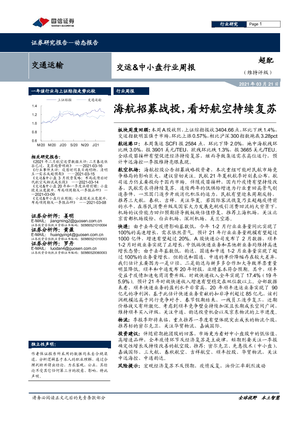 【国信证券】【20210321】交运&中小盘行业周报:海航招募战投,看好航空持续复苏-17页