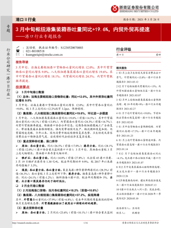 【浙商证券】【20210328】3月中旬枢纽港集装箱吞吐量同比+19.6%,内贸外贸再提速-16页