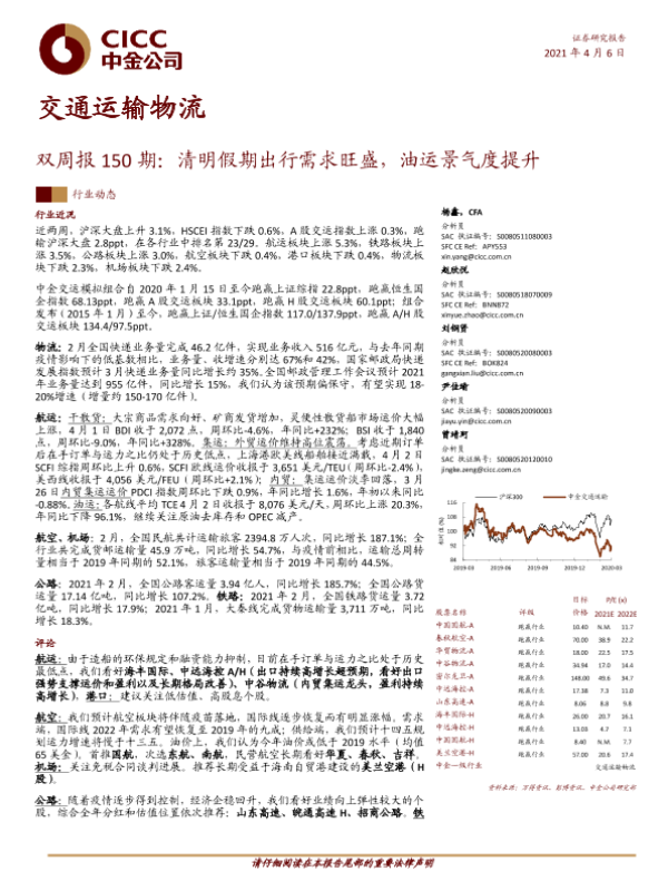 【中金公司】【20210406】交通运输物流双周报150期:清明假期出行需求旺盛,油运景气度提升-26页