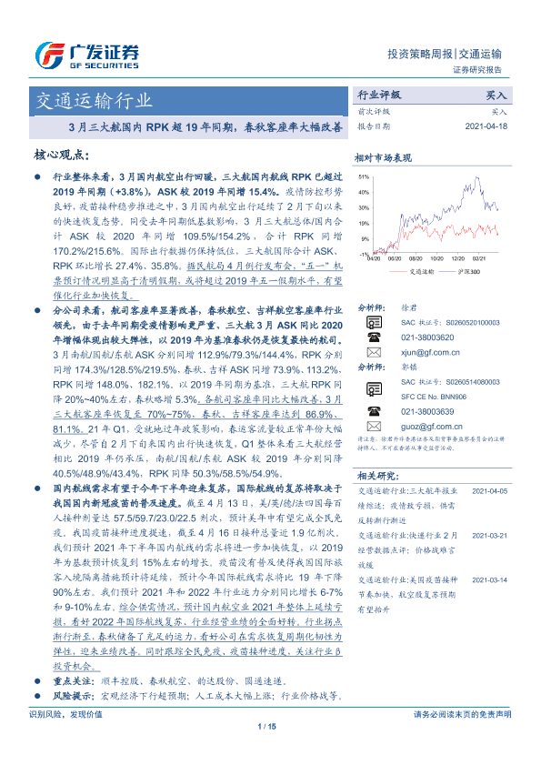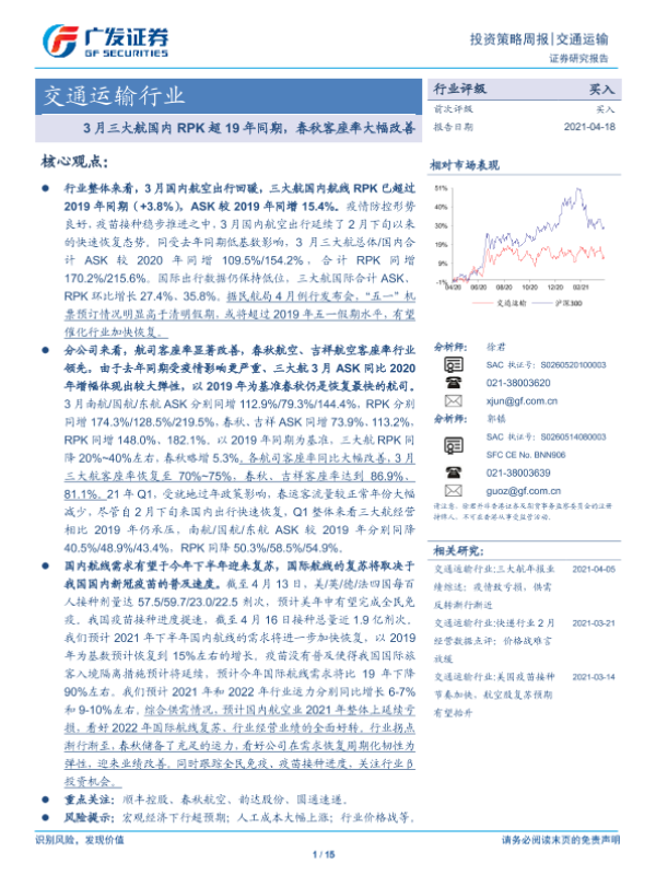 【广发证券】【20210418】3月三大航国内RPK超19年同期,春秋客座率大幅改善-15页