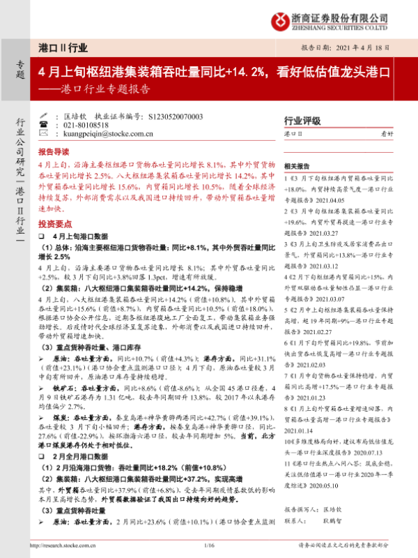 【浙商证券】【20210418】4月上旬枢纽港集装箱吞吐量同比14.2%,看好低估值龙头港口-16页