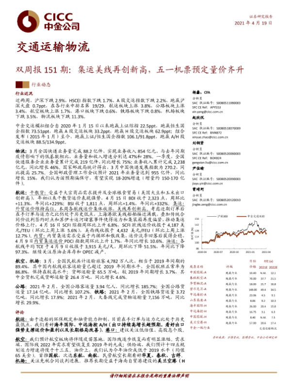 【中金公司】【20210419】交通运输物流双周报151期:集运美线再创新高,五一机票预定量价齐升-22页