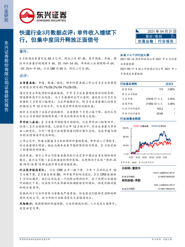 【东兴证券】【20210421】快递行业3月数据点评:单件收入继续下行,但集中度回升释放正面信号-9页