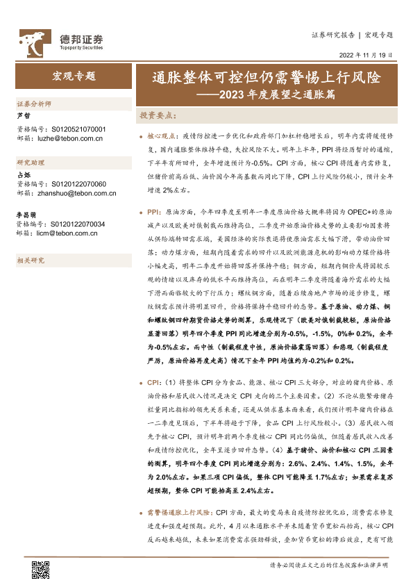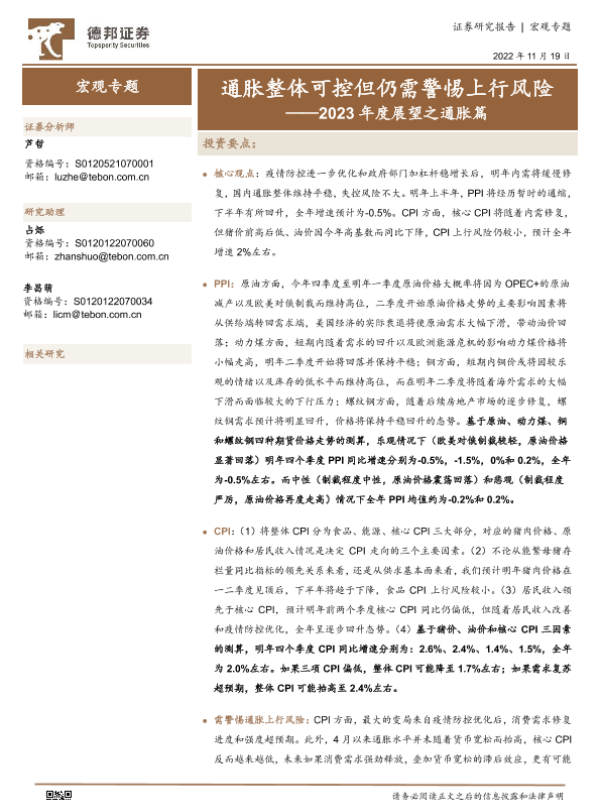 【德邦证券】【20221119】2023年度展望之通胀篇:通胀整体可控但仍需警惕上行风险-20页