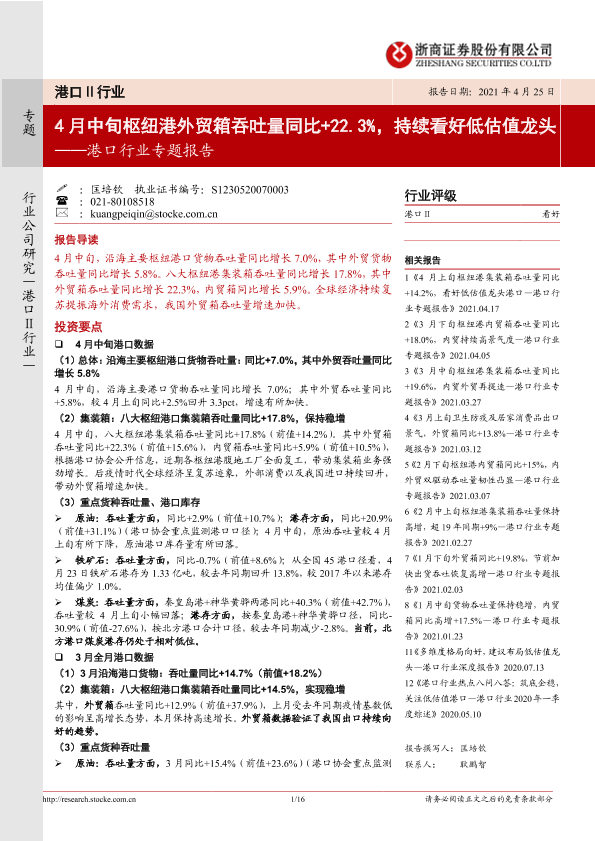 【浙商证券】【20210425】4月中旬枢纽港外贸箱吞吐量同比+22.3%,持续看好低估值龙头-16页