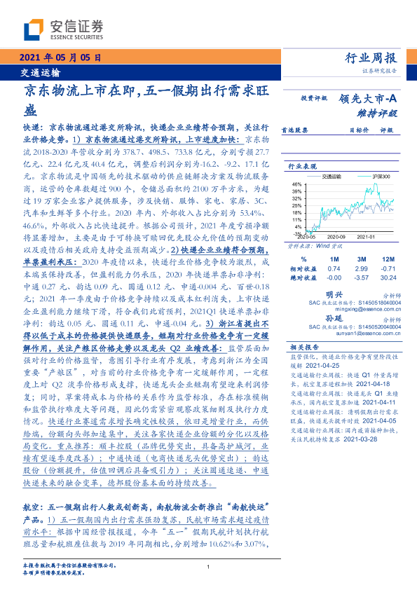 【安信证券】【20210505】交通运输行业周报:京东物流上市在即,五一假期出行需求旺盛-19页